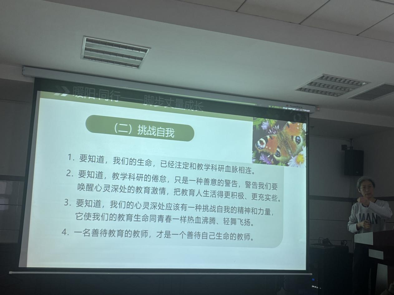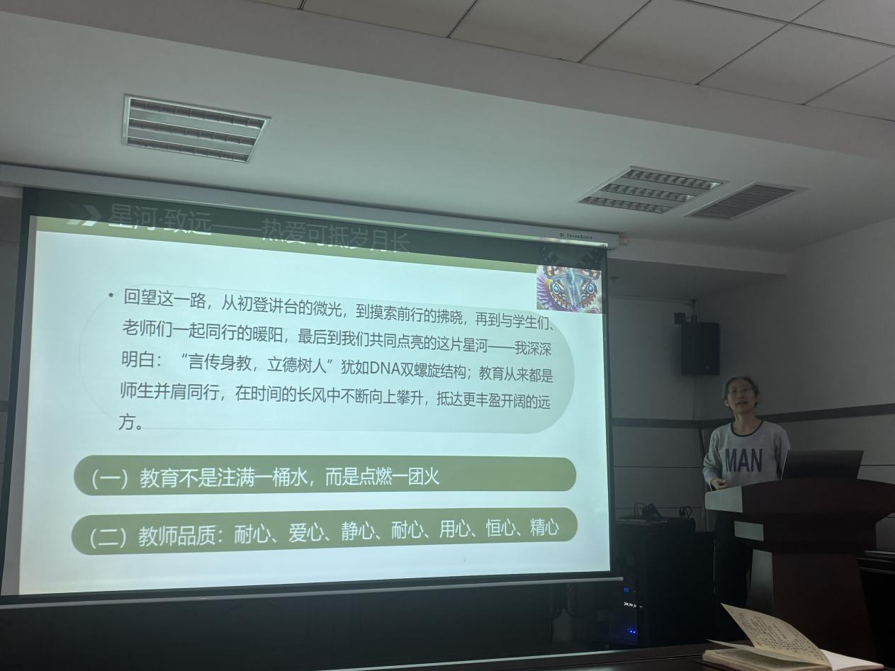 史丽教授以“萤火微光亦可照亮星河”为题,结合自身从教感悟,系统阐述了青年教师的成长之路。她指出,从教之初需在期待与迷茫中坚守育人初心,于学生眼中看见光,在讲台上树立自尊自信,找准自身发展的生态位。成长必经磨砺,要勇于接受挑战,耐住寂寞、做好规划、善于合作、吃苦耐劳,以健康体魄支撑永不放弃的追求。她鼓励青年教师用脚步丈量成长,勤于学习请教,敢于挑战自我,构建师生和谐、互惠共赢的育人共同体。最后,史教授强调,教育是点燃火焰而非注满容器,教师应以耐心、爱心、静心、用心、恒心、精心投身事业,永葆好奇心与柔软的坚持力,在彼此照亮中传承教育家精神,以萤火微光汇聚成照亮学子的璀璨星河。