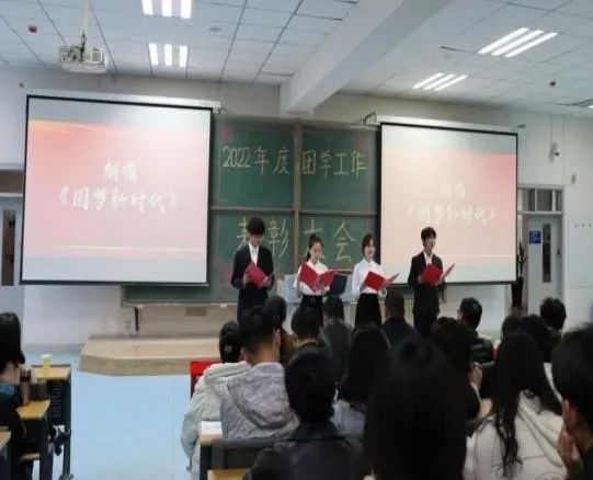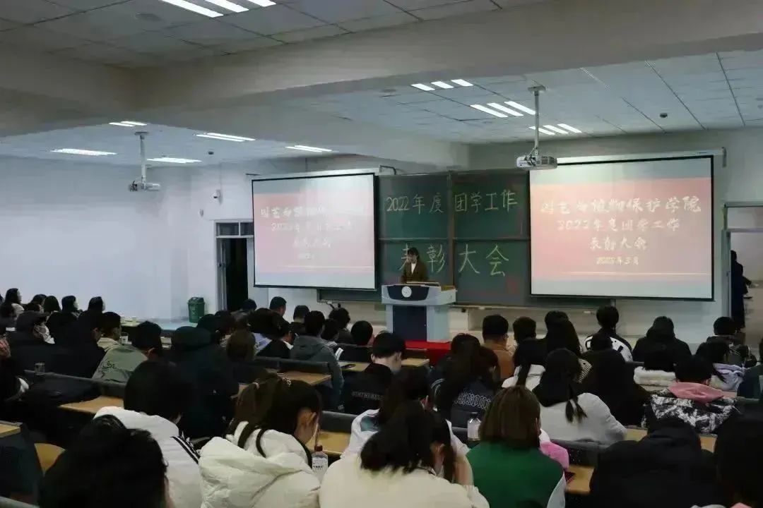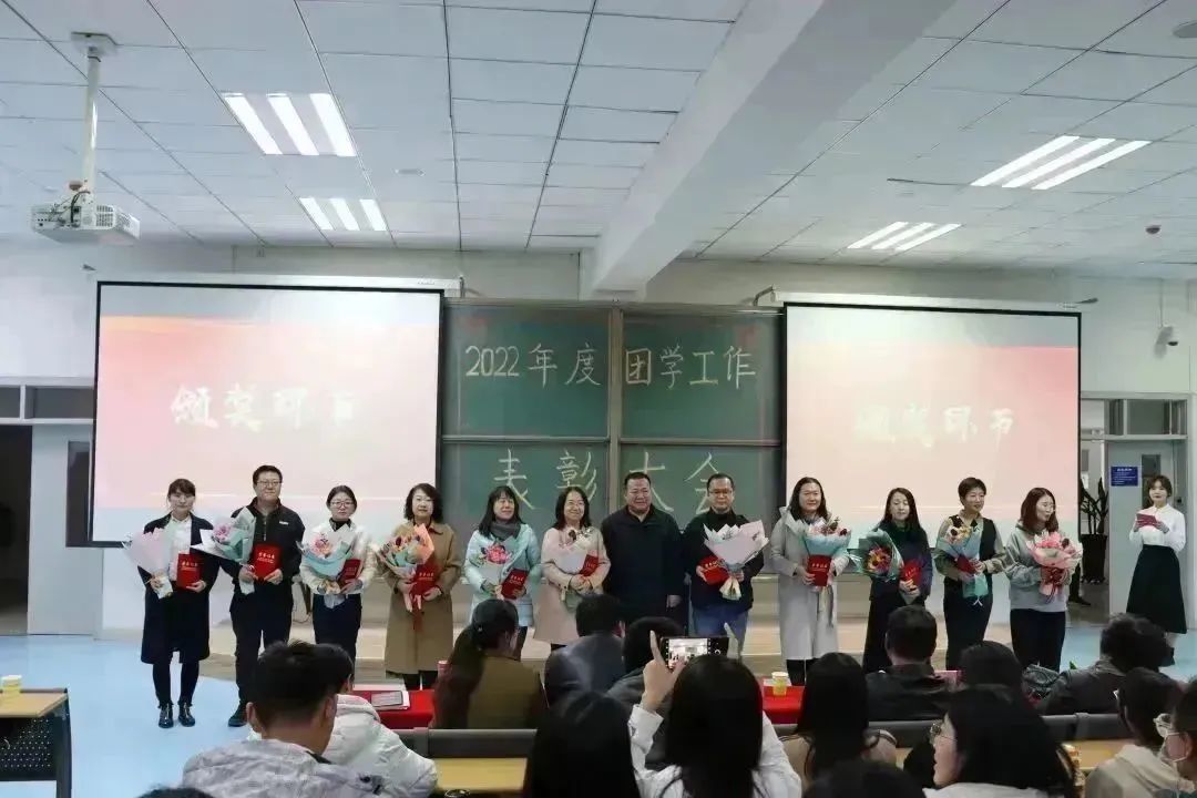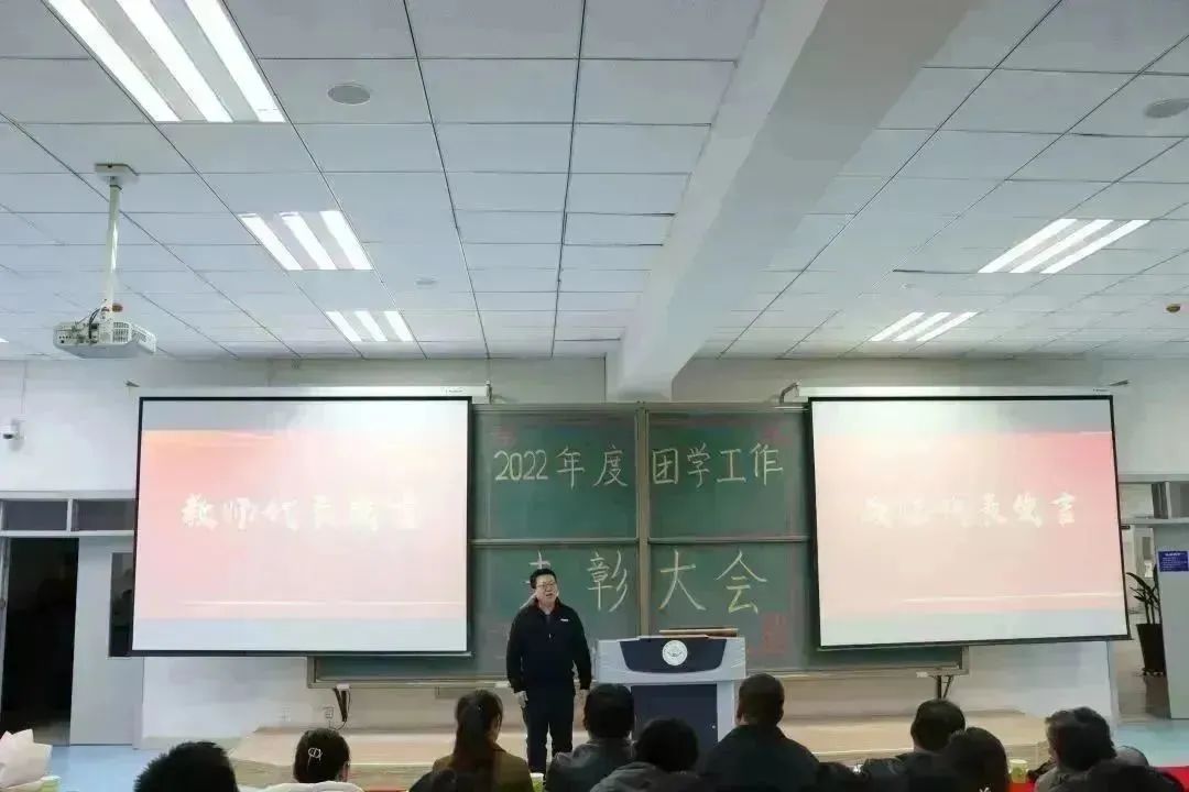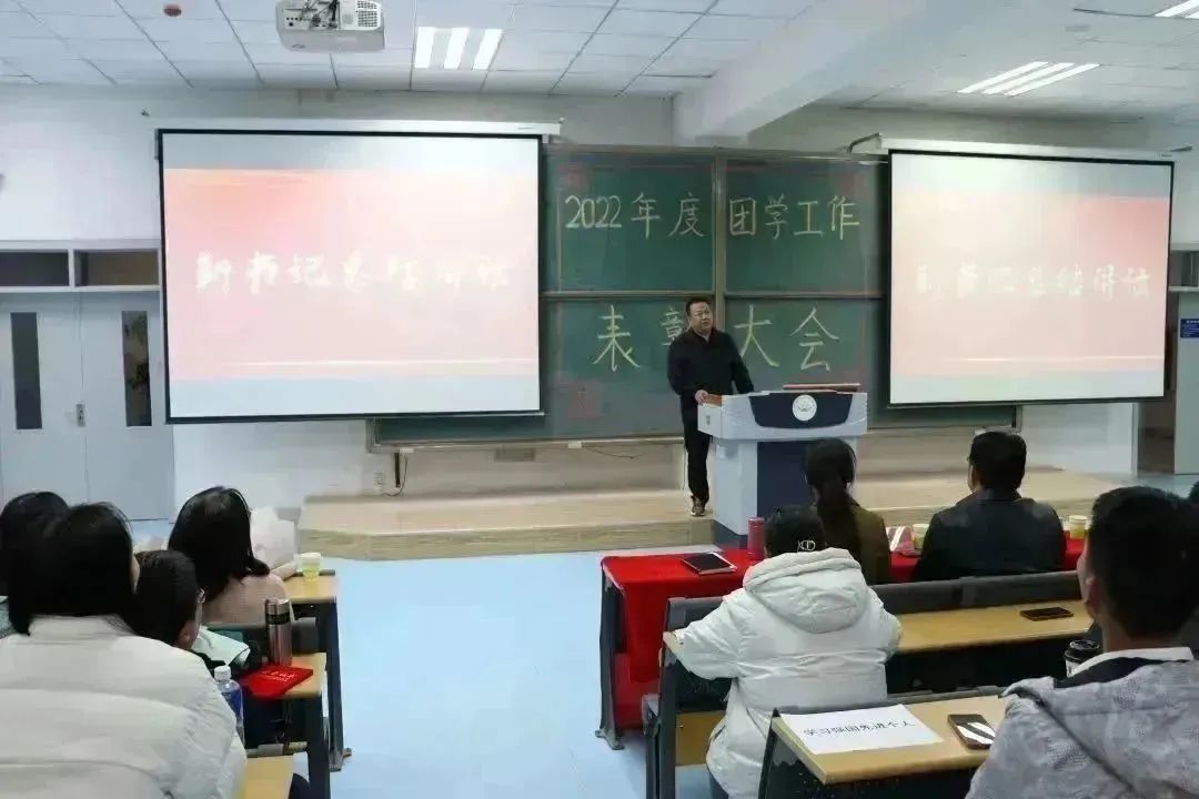 在南教114教室召开2022年度团学工作表彰大会。学院党委书记靳国斌、党委副书记李艳、副院长刘杰才、副院长杨忠仁、关工委副主任孙伯筠出席此次会议。教研室主任、班主任、辅导员、获奖教师、获奖学生以及学生代表共计200余人参加会议。