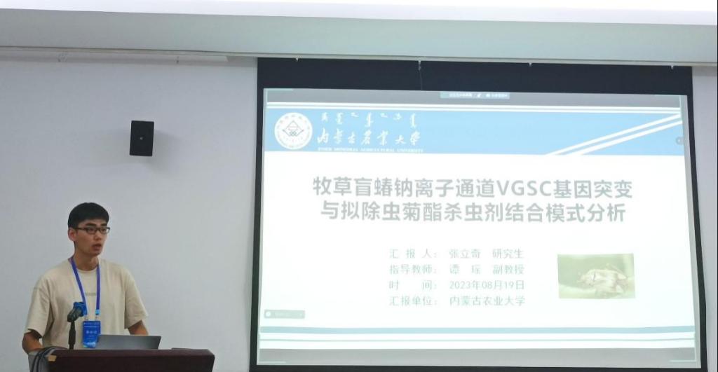 2022级硕士研究生张立奇以《牧草盲蝽VGSC基因kdr与super-kdr的分子检测及其与拟除虫菊酯类杀虫剂的结合模式》作报告。通过牧草盲蝽的电压门控钠离子通道(Voltage-gated sodium channel,VGSC)的基因全长,根据推导出的氨基酸序列,通过同源建模的方法构建其三维结构及跨膜区域,采用分子对接的方法分别分析其突变前后与六种拟除虫菊酯类杀虫剂的结合模式。旨在明确牧草盲蝽对拟除虫菊酯类杀虫剂的抗性相关突变,为合理选择杀虫剂提供参考。
