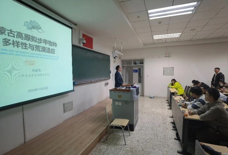 南教A218如期举行,108名师生聆听了河北大学任国栋教授的特邀讲座。任教授主研昆虫多样性、甲虫系统学、昆虫生物地理学、文化昆虫学等;开创性开展了中国20多个未知甲虫科的系统分类研究,命名昆虫新属种近700个;主持科研项目83个(国家级32项,省部级和社会项目51项),获得省部级成果8项;编著学术专著52部,发表论文600余篇;在昆虫区系和区域生态地理方面提出新观点;指导9项大学生科技竞赛作品荣获全国奖项。