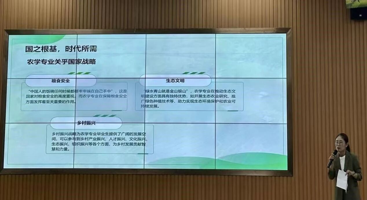 讲座伊始,学生工作办公室就业负责老师王荣以农业战略价值为引,向新生阐释其对国家发展的根基作用,通过鲜活案例与前沿图景,展现智慧农业科技赋能新貌。她系统梳理就业核心路径,详解企业招聘、基层项目、科研深造等方向的准备要点。王老师特别叮嘱同学们善用学校资源,把握实践平台与机会提升自我,为未来发展奠基。她殷切期望新生在学院成长中,不仅实现个人突破,更将个人价值融入国家发展大局,以专业所学服务"三农",在时代浪潮中书写青春担当。