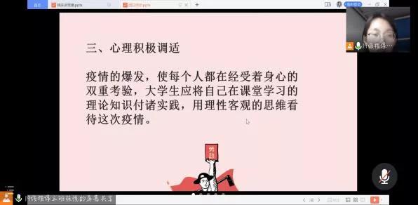 班主任老师李艳艳强调了同学们面对疫情要保持理性,听从学校、学院疫情防控的要求,确保自己安全的情况下好好学习,及时复习,善于总结,在本学期末每位同学都能够上交一份满意的答卷。