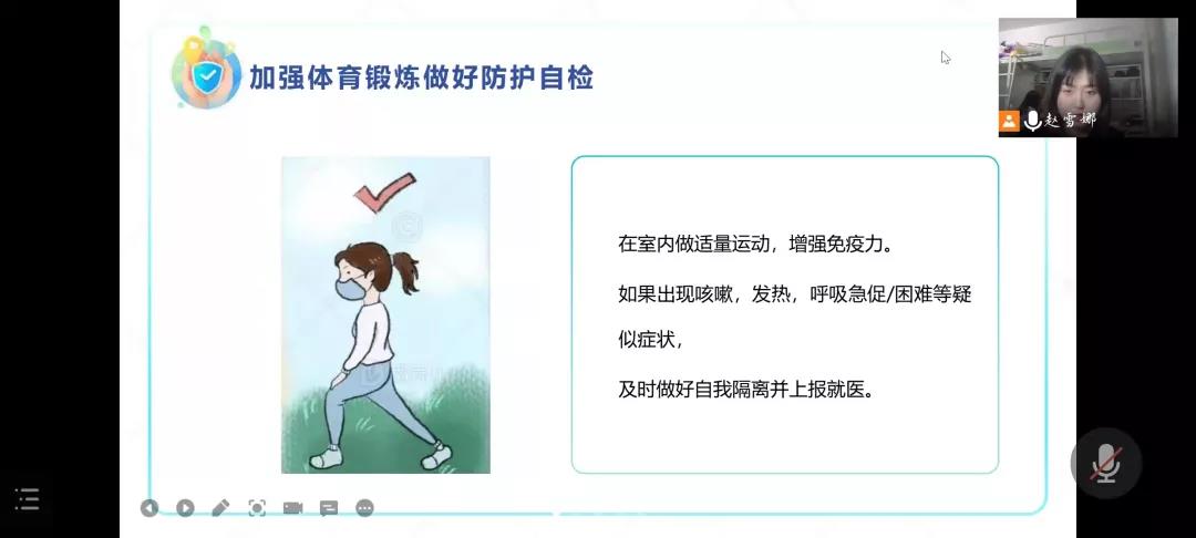 围绕“疫”情防护,团支书指出同学们要注意保持宿舍的清洁,并倡导同学们要加强体育锻炼做好防护自检、注意防寒保暖,及时增减衣物以及勤给常用物品消毒等。
