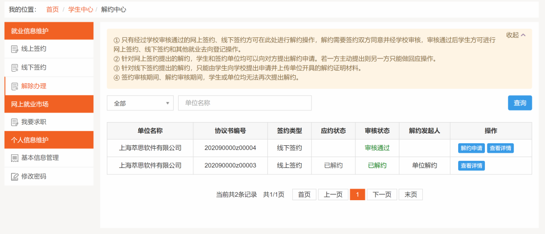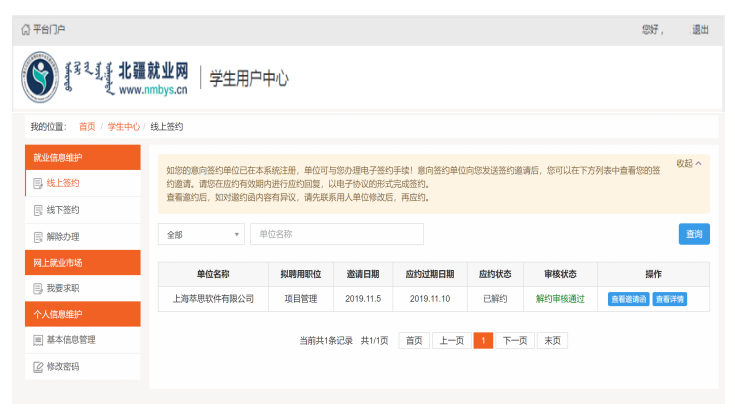线上签约: 单位邀约→学生应约(生成协议书)→学院审核→学校审核