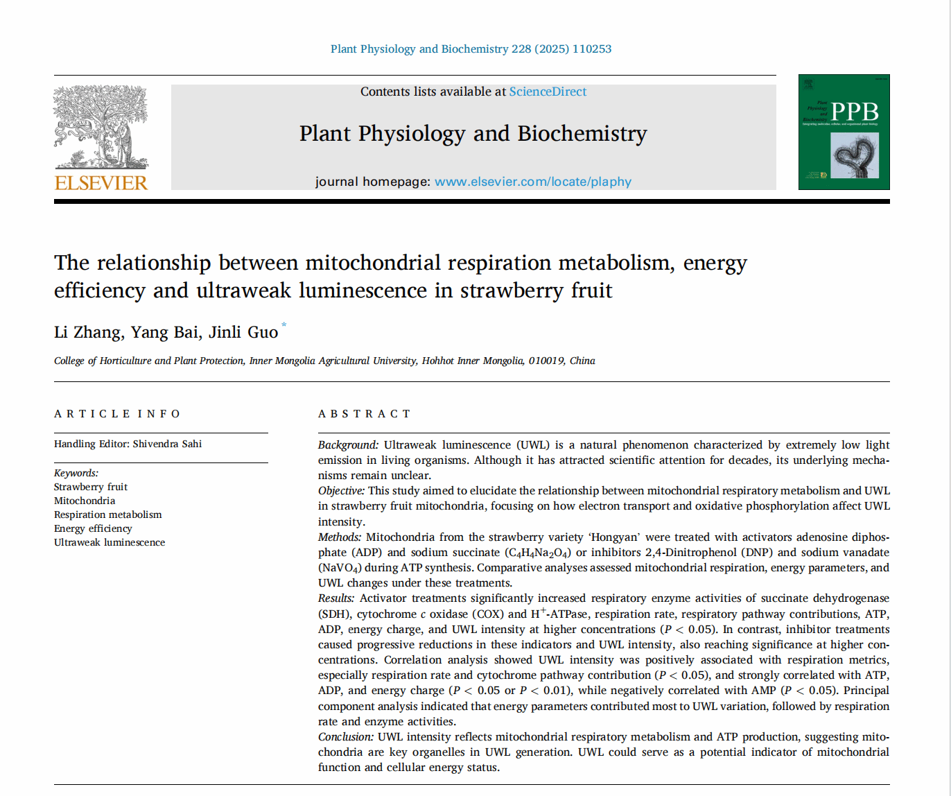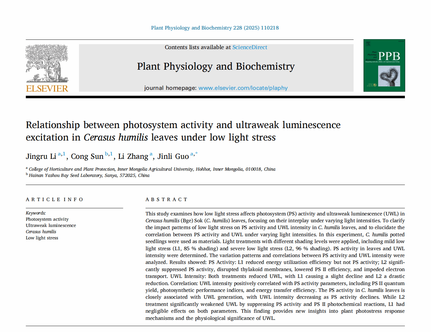 为第一单位,在《Plant Physiology and Biochemistry》(中科院二区TOP期刊)上发表2项题为Relationship between photosystem activity and ultraweak luminescence excitation in Cerasus humilis leaves under low light stress和题为The relationship between mitochondrial respiration metabolism, energy efficiency and ultraweak luminescence in strawberry fruit的研究成果。2篇论文分别以酷爱成人网