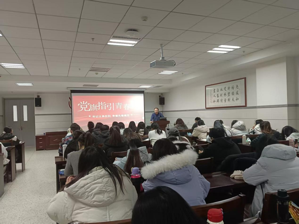 第十四期发展对象于生科楼419室开展党课培训班第八次学习。本次党课主题为《党旗指引青春路》,由我校党委组织部党校负责人张永亮老师讲授。