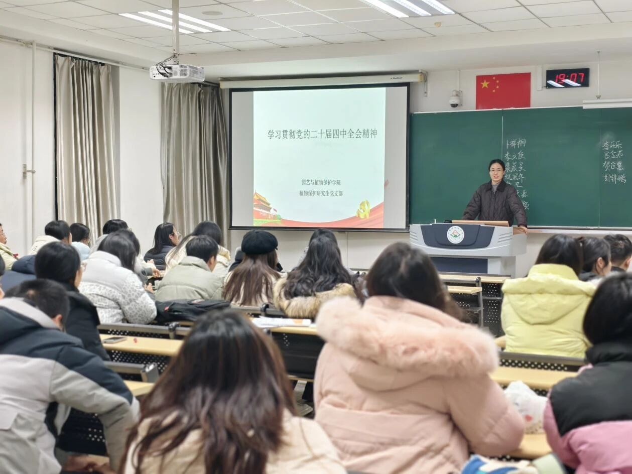 为深入学习贯彻党的二十届四中全会精神,教育引导植保专业研究生将理论学习与专业实践紧密结合。12月6日晚,植物保护研究生党支部召开开展学习党的二十届四中全会精神专题学习,赋能植保科研,助力农业现代化。支部全体党员、入党积极分子通过专题党课、视频观看、实践分享等,深刻领会全会精神核心要义,并结合植物保护专业特色,探索将全会部署转化为科研报国、服务“三农”的具体行动。