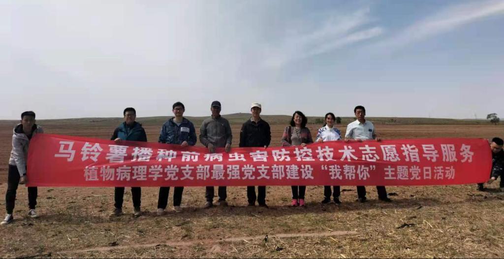 在纪念中国共产党成立100周年临近之际,为进一步深入推进党史学习教育、扎实开展“我为师生办实事”实践活动,充分发挥基层党组织战斗堡垒作用、党员先锋模范作用和党员领导干部表率作用,植物病理党支部以最强党支部建设为载体,结合专业特色,践行初心使命,于5月20日上午赴四子王旗公合成乡吉卜太村开展了“我帮你”主题党日活动,对当地的马铃薯种植户进行了马铃薯播种前病虫害防控技术志愿指导服务。植物病理党支部的联系领导周洪友副院长(主持工作)和农大党委统战部王琛老师参加了此次活动。