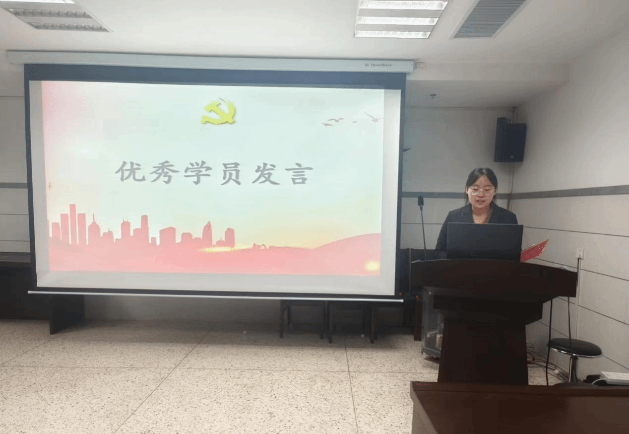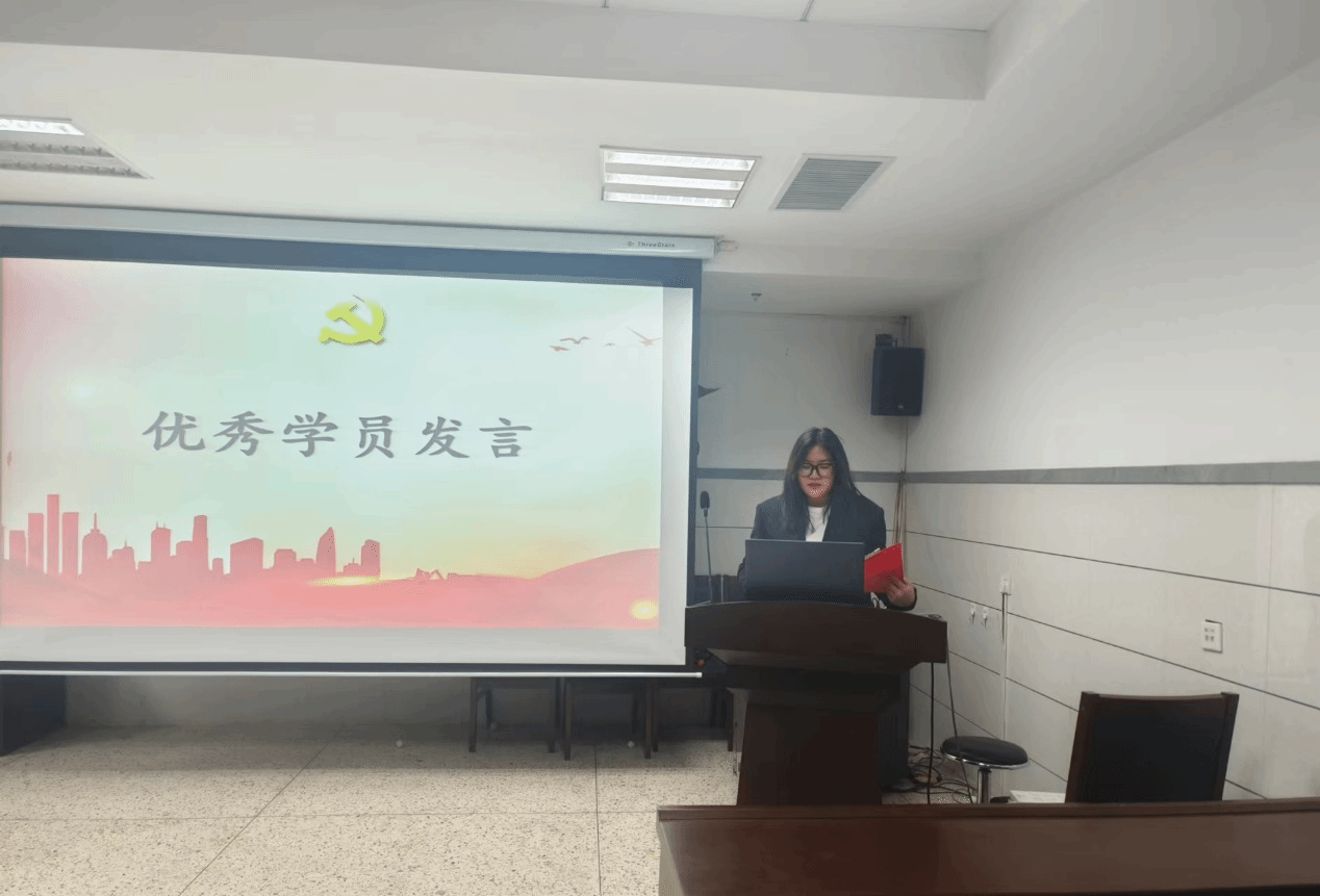 积极分子优秀学员代表张彤上台发言,她说:“生命不息,奋斗不止”,要戒骄戒躁、面向未来;勇往直前、砥砺奋斗;敢于变革、勇于创新。时至今日,伟大复兴的光荣之路并非一片坦途,但是“山再高往上攀,总能登顶;路再长,走下去,定能抵达”。故此,作为一名优秀积极分子,要继续学习,努力向党组织靠拢。作为新时代的赶考者,不忘初心、面向未来、继续奋斗,才能向历史和人民交出新的、更加优异的答卷。