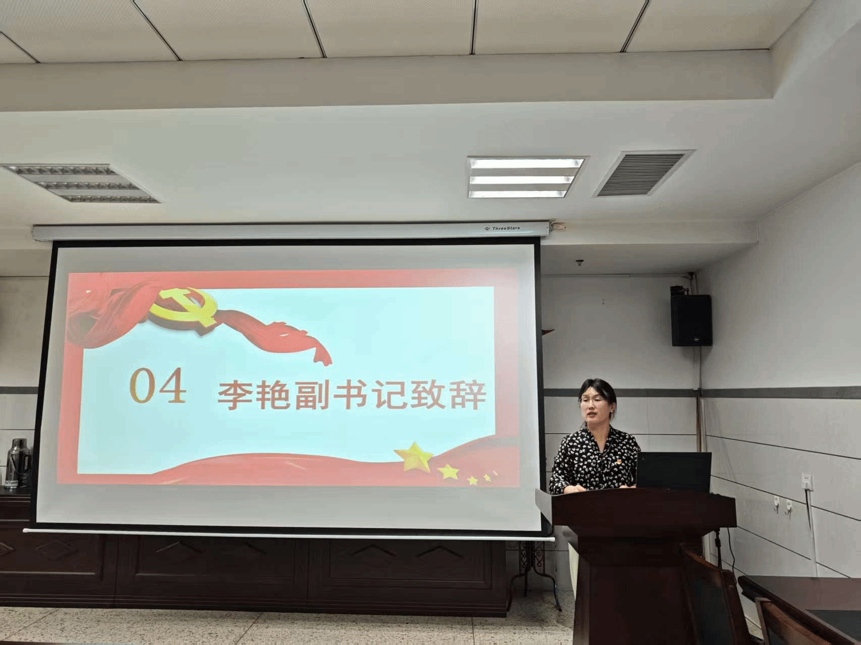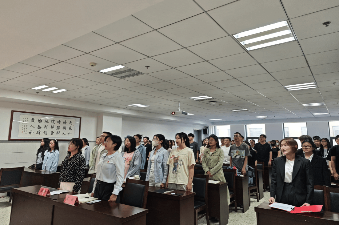 党委副书记李艳老师、党委组织员尤丽老师出席。会议第一项,全体参会人员面向国旗,奏唱国歌。