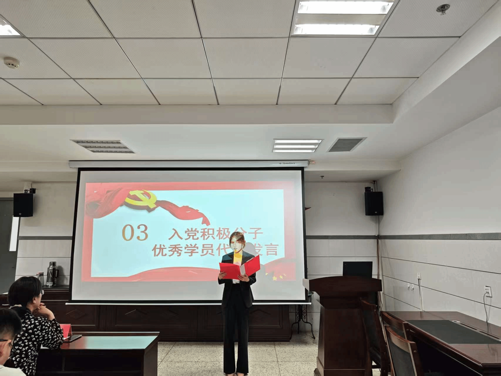积极分子优秀学员代表李沛臻上台发言,她说:“路漫漫其修远兮,入党之路任重而道远, 我们应该将此次学习作为新的起点,不忘初心,牢记使命,以思想之光引航,用行动之力逐梦,不负期待,不负韶华,努力向党组织靠拢,争取早日成为一名光荣的共产党员,为实现中华民族伟大复兴的中国梦贡献自己的青春力量。”在最后,她再次感谢党组织和老师们的辛勤付出,让他们在党课学习中不断成长。