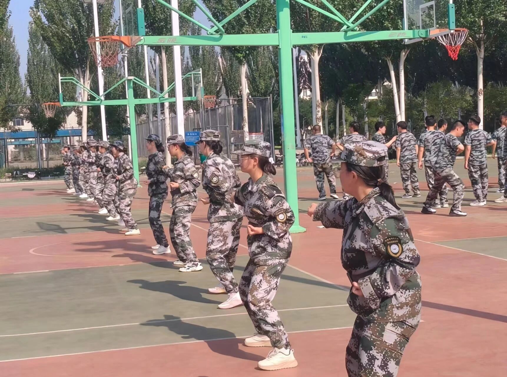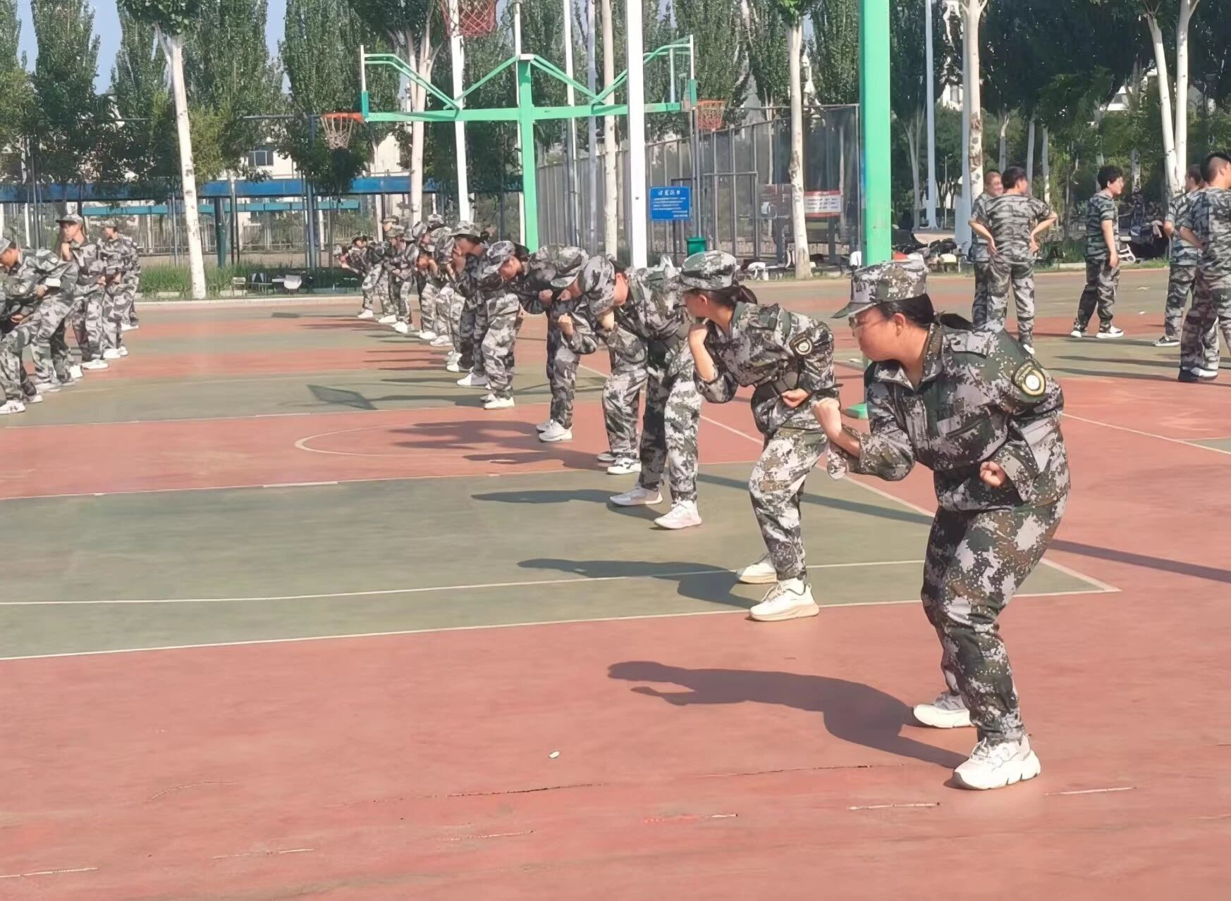 训练场上,迷彩服与汗水交织,拳风与口令声共振,是新生以饱满的热情迎接体能与意志的双重考验。他们用反复挥出的拳影丈量青春,在一招一式的打磨中见证成长。在教官的悉心指导下,经过整日的汗水浸润与坚持,新生们的动作愈发整齐划一,眼神也更添几分坚定。这场烈日下的军体拳训练,正悄然塑造着他们的坚韧品格与集体荣誉感。