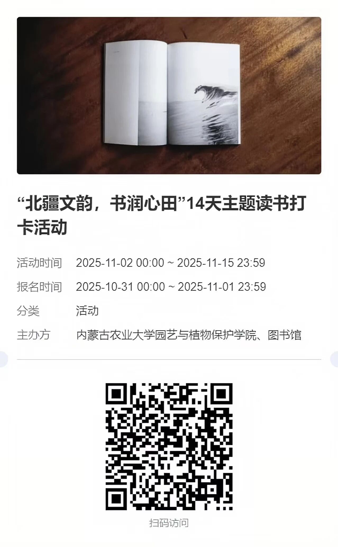 为激发师生阅读热情,营造浓郁书香校园氛围,酷爱成人网 联合图书馆共同发起“北疆文韵,书润心田”14天主题读书打卡活动,将于2025年11月2日至11月15日正式开展。