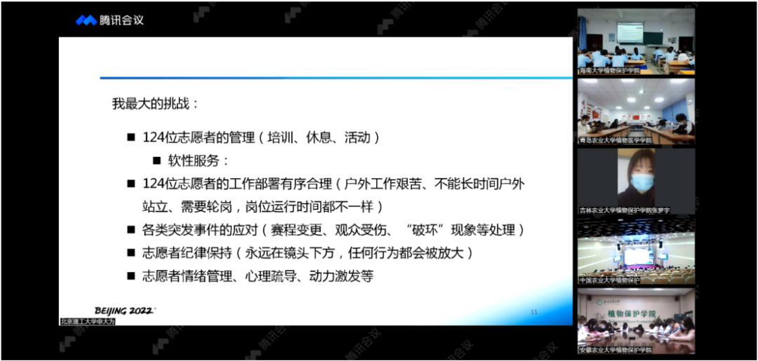 各所高校的植保学子分享了学习的感悟,冬奥会的一切,不仅让我们感受到了中国文化的深情与浪漫,同时也深刻感受到了属于中国青年的温暖和力量。在这个寒冷的初春,坚守岗位是一种温暖;把平凡岗位上的工作做到极致是一种温暖,将每一个人的微薄之力汇聚在一起,一起向未来的力量也是一种温暖。