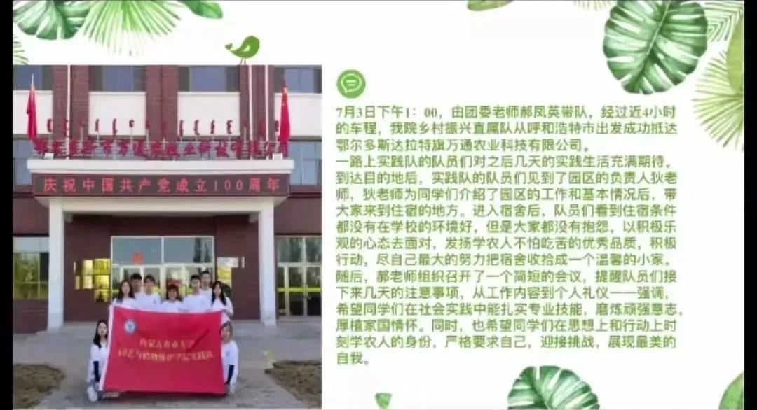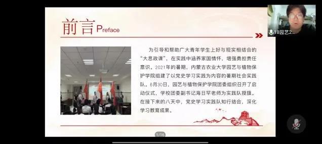 的三直属队队员与所有的参会同学分享了他们在社会实践中的所思所悟。乡村振兴实践队的张芷若分享了同学们在鄂尔多斯达拉特旗万通农业科技有限公司的实践活动,在实践活动中,大家以积极乐观的心态发扬学农人不怕吃苦的优秀品质,积极行动,扎实专业技能,磨练顽强意志,严格要求自己,迎接挑战,展现最美的自我。国情观察实践队的李萌同学与大家分享了实践队成员在深入阿吉拉沁社区党群服务中心后,通过参观,走访调研等多种形,走进社会、贴近生活,真正的为社会和人民群众办实事。党史学习实践队的何文炳,通过小视频、ppt的展示将队员们在社会实践中活动内容进行分享,并在分享中讲述到自己的成长与感悟。最后,郝老师总结到社会实践活动是在校大学生坚定理想信念,磨练坚强意志,培养奉献精神的重要途径,希望每一位同学都能够积极投身于社会实践活动中,在实践中成长,在实践中增长才干。