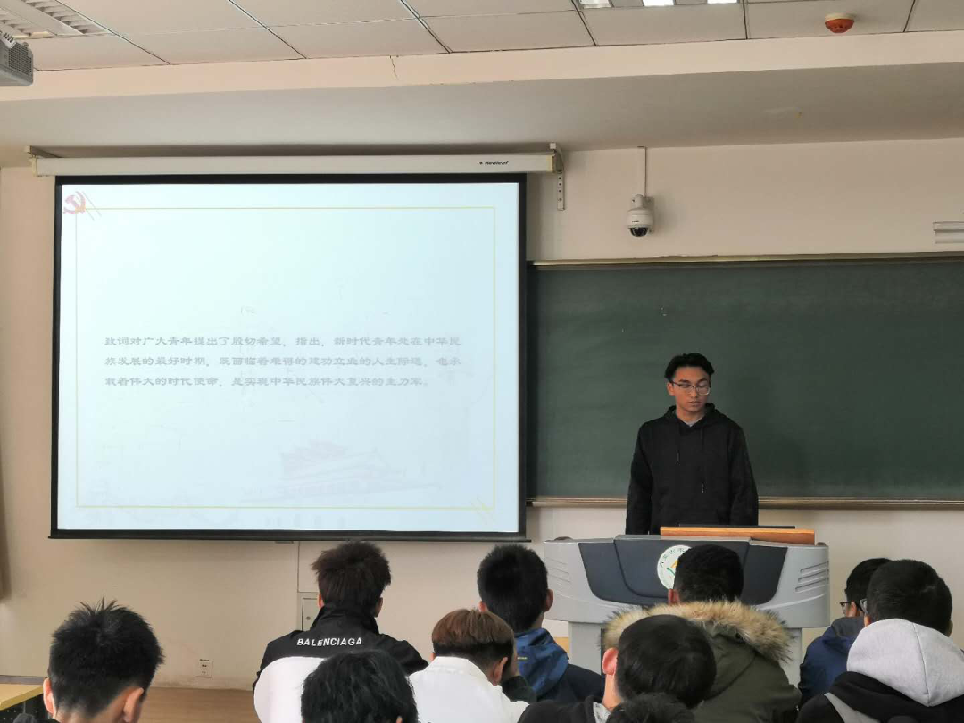 活动伊始,团支书杨梓航首先向同学们介绍了本次团日活动的主题和意义。随后,宣传委员刘宝林向同学们传达了习近平总书记致全国青联十三届全委会和全国学联二十七大贺信,讲到:我国广大青年要坚定理想信念,培育高尚品格,练就过硬本领,勇于创新创造,艰苦奋斗,用自己的力量为祖国做贡献。活动最后,杨梓航组织全班同学共同合唱《我和我的祖国》。