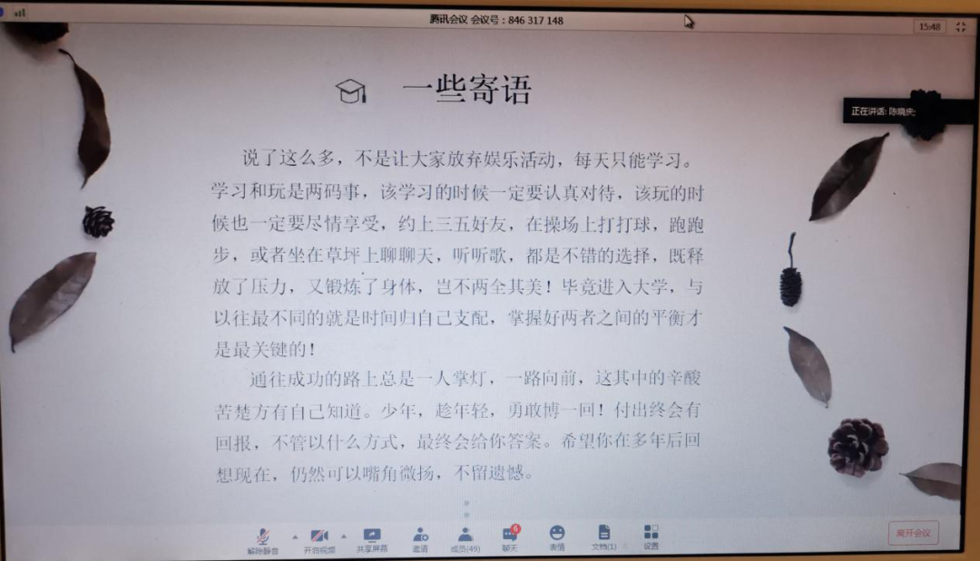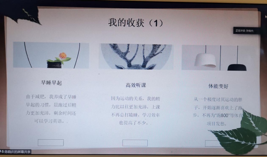 主讲人陈晓庆在活动中给大家分享了自己在农大的蜕变之路,从180斤的“胖子”到90斤的“瘦子”,陈晓庆讲到:自己减肥成功的最大原因是有永不放弃的精神,因为体态问题不被看好,所以就下定决心开始减肥。同时,这场蜕变也给她带来了许多收获, 意志力得到磨砺的同时自己也越来越自信。谈到学习,陈晓庆说:“从始至终从未想过自己会保研,只是习惯性地努力,做好自己该做的事,也许这就是对我所付出的努力最大的肯定与回报。”讨论环节,陈晓庆也给大家分享了自己保研的一些心得,英语四级的学习方法,期末复习的方式等。最后,陈晓庆将自己的座右铭“努力了不一定成功,但是不努力一定成功不了”送给大家共勉。
