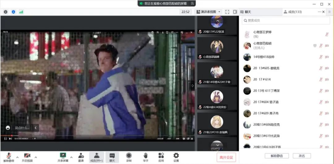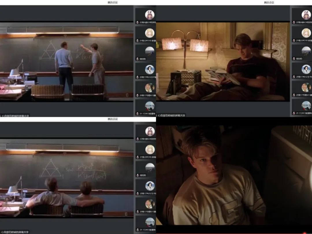 在线上举办心理电影《心灵捕手》的观看活动,各年级以宿舍为单位进行观看。影片讲述了主人公威尔(WillHunting)是一名麻省理工的清洁工,虽然他在数学方面有着过人天赋,却是个叛逆的问题少年。不过他在教授蓝勃、数学家桑恩和朋友查克的帮助下,最终打开心灵,消除了人际隔阂,并找回了自我和爱情的故事。