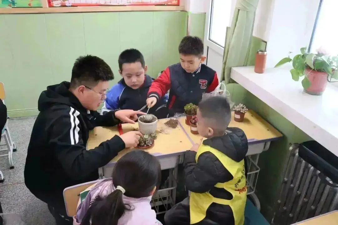 的学生党员、学生干部细心协助小朋友们进行多肉盆栽,在大哥哥大姐姐的帮助下,一盆盆精美的多肉植物呈现在大家面前。