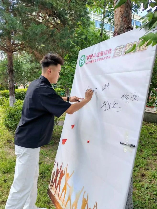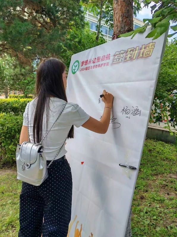 除了常规的迎新流程,学院还在新生宿舍楼下设立创意签名墙,让新生们在内农大留下了自己的第一笔。同时,学院还为新生们准备了属于自己的校园卡卡套,其上印有学院院徽和本人姓名及新生寄语,勉励同学们勇敢面对挑战,书写人生华章。