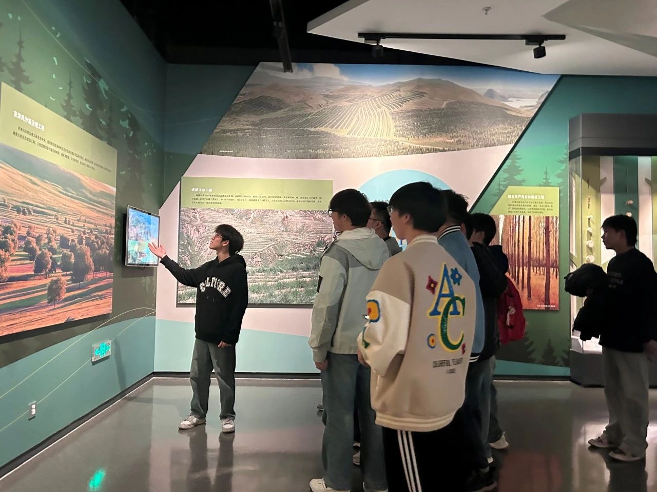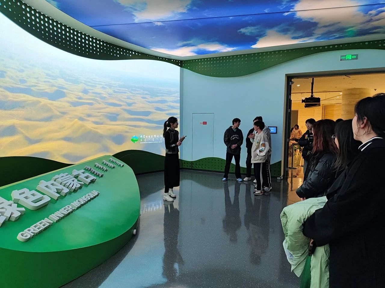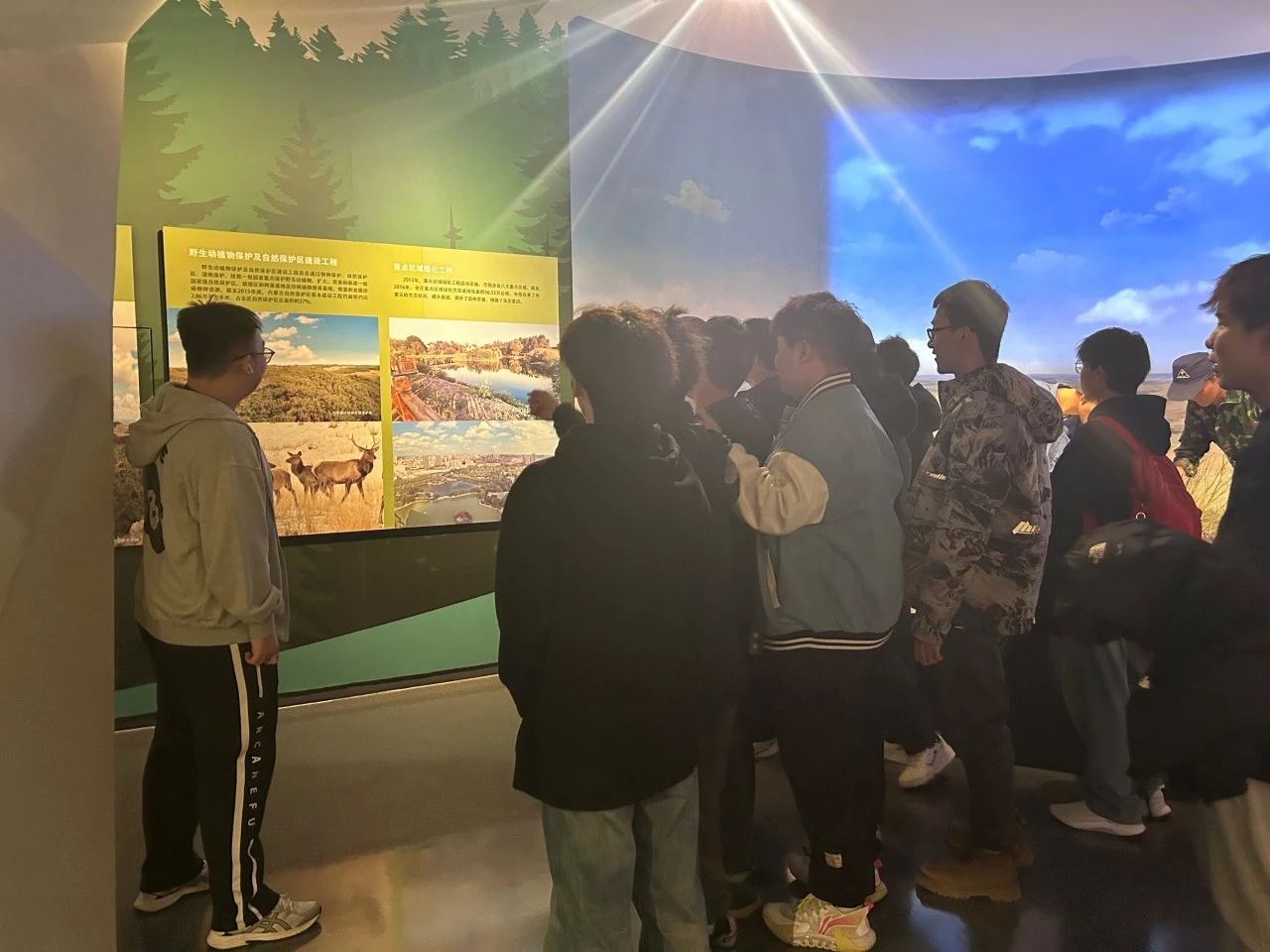 活动当天,同学们满怀期待早早来到自然博物馆。一踏入博物馆,大家便被浓厚的科学氛围所包围。从承载着岁月痕迹的远古生物化石,到展现蓬勃生机的现代生态系统;从记录内蒙古独特变迁的地质演变,到种类繁多的丰富动植物资源,每一件展品都仿佛在诉说着自然的奥秘,深深吸引着同学们的目光。在团支书郭一冉的引导下,同学们走进四楼“绿色内蒙古”展厅,并由团支书进行简单的讲解。