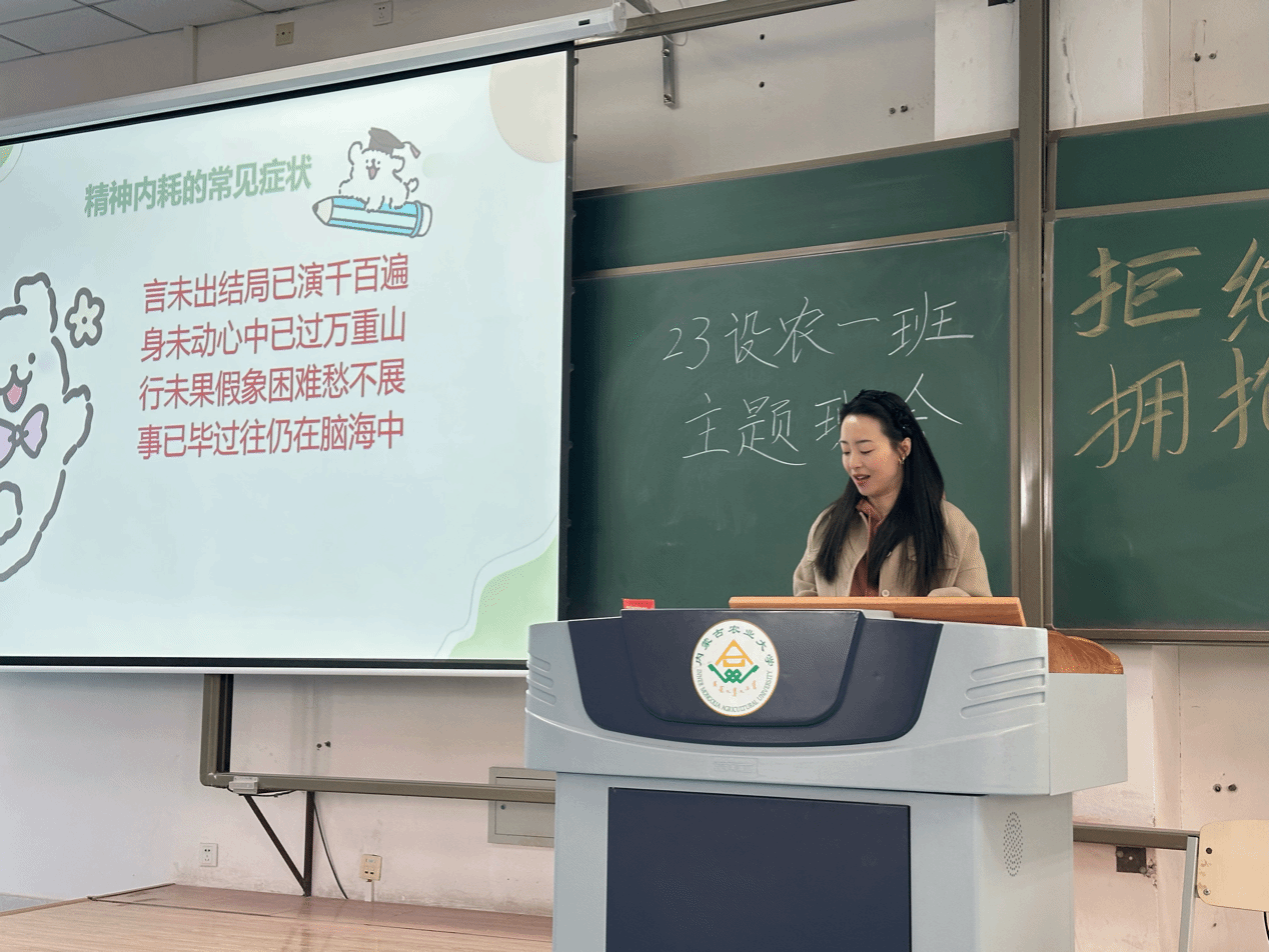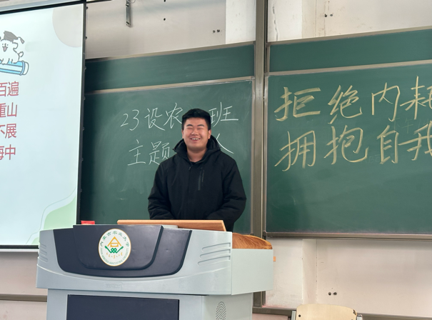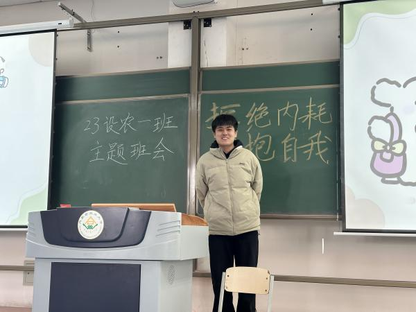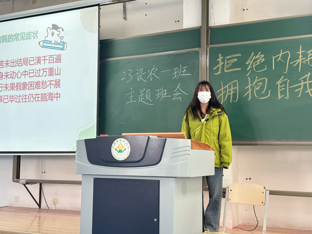 23级设农一班开展了以“拒绝内耗,拥抱自我”的线下主题班会,班主任潘璐参加会议,23级设农一班的郭静宜主持会议,该班会在班级内掀起了一股相信自己,永攀高峰的热潮。