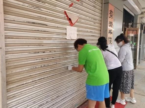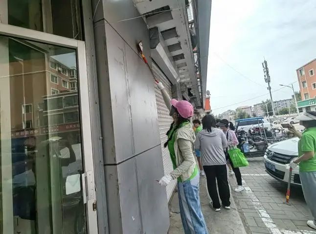 在上午清理过程中,实践队成员分为三组。一组队员拿着铁铲、除污剂等工具,对周围街道商铺门面房上的小广告进行清理。二组队员在小区内进行卫生清理工作,实践队成员在劳动过程中展现出不怕苦、不怕脏、不怕累的精神,齐心协力,分工明确,快速高效地完成了清理工作,勤劳的身影成为街区内一道靓丽的色彩。经过一上午的实践活动,社区周围临街商铺卫生面貌整体上得到了上升,小区内的环境也面目一新,大家用自己的辛勤付出,为社区居民营造了一个干净整洁的生活环境。