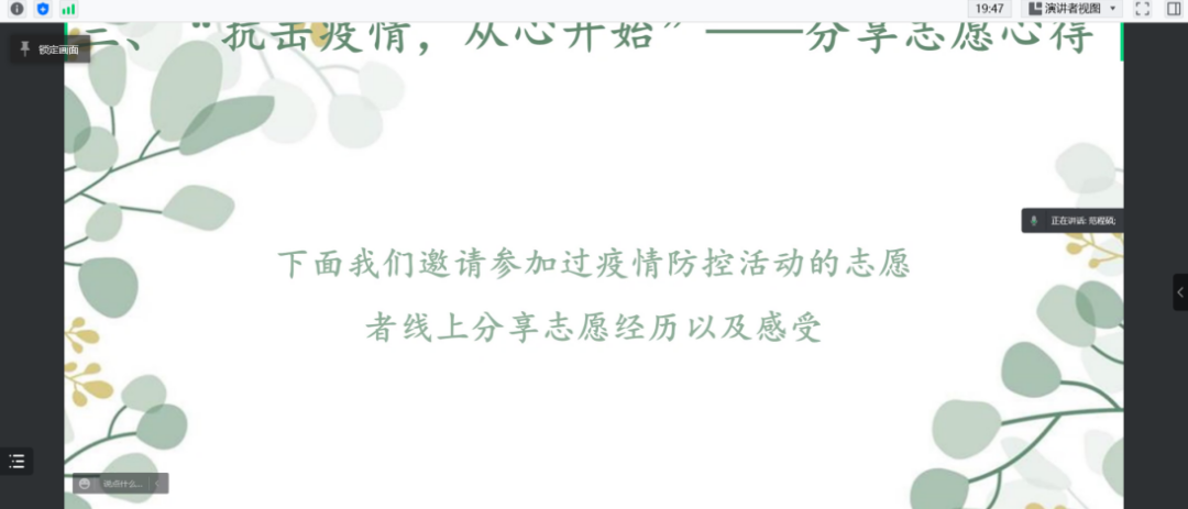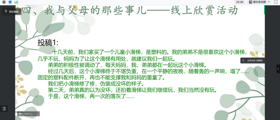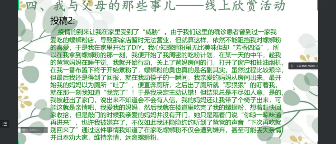 之后,戈荣和刘策两位同学向大家分享了疫情居家上网课时“我与父母的那些事儿”,体现了家的温暖。