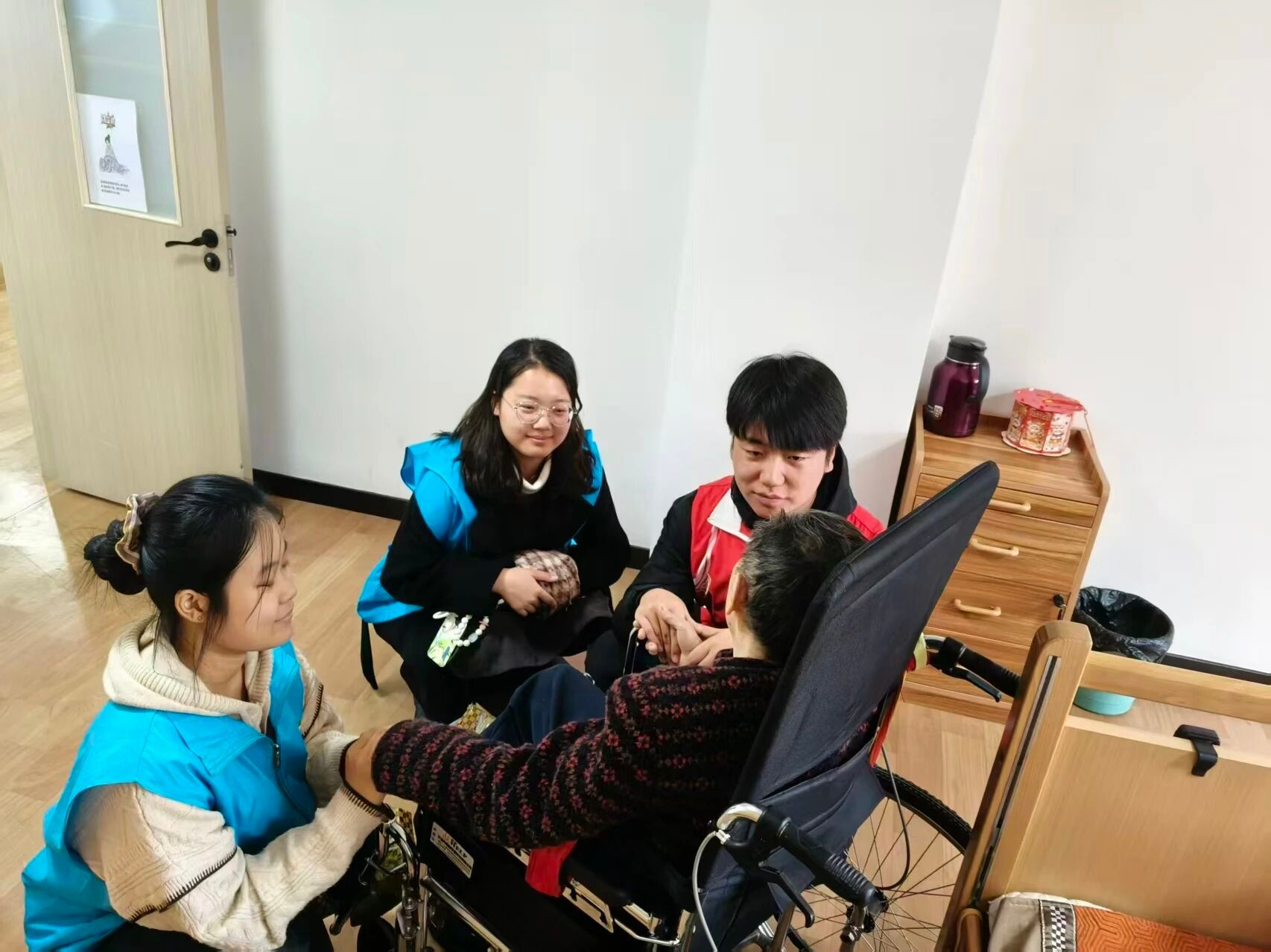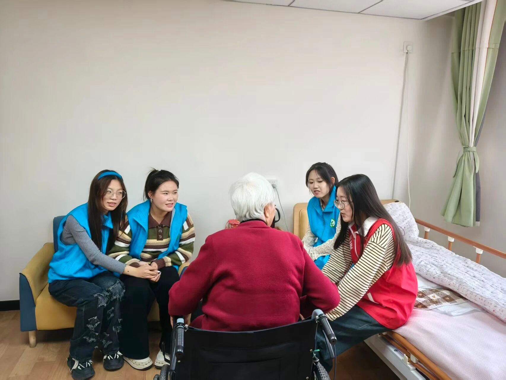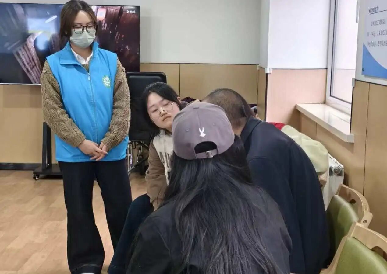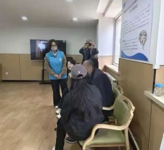 活动中,志愿者们主动与大厅里的老人打招呼,随后热情地坐在老人身边,开启了一场“家庭式”交流。有的志愿者围坐在几位老人中间,听他们回忆往昔生活点滴、讲述工作经历;有的志愿者则一对一陪伴行动相对不便的老人,从天气变化、饮食起居聊到家里日常,用轻松的语气分享身边新鲜事,让老人的脸上渐渐绽开笑容。