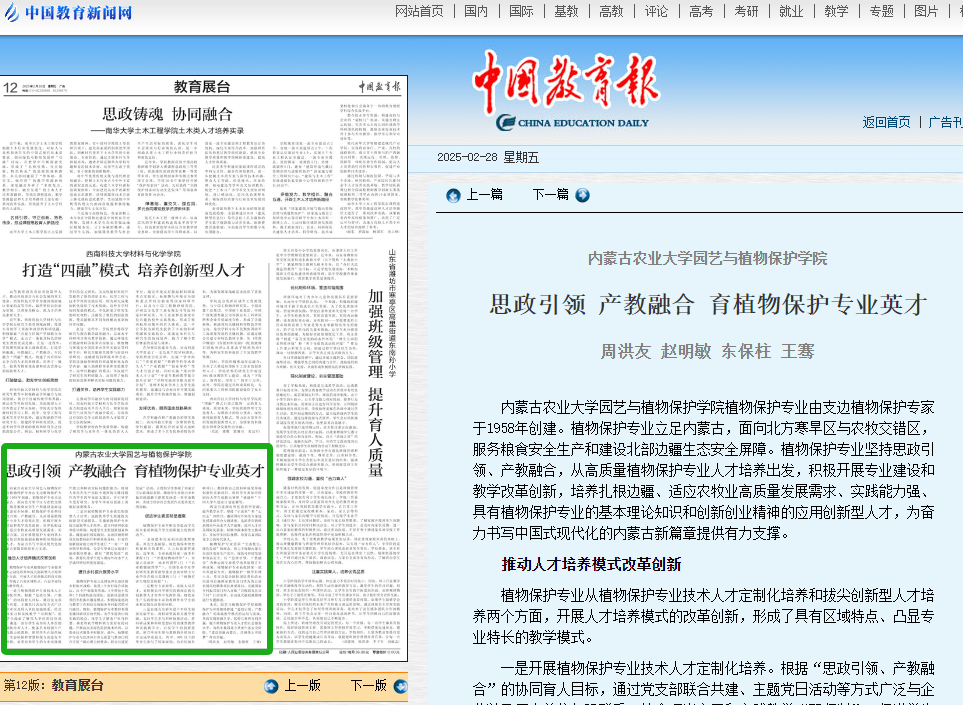 植物保护专业秉承“生态优先,绿色发展”的理念,致力于保障内蒙古自治区农业生产安全、绿色可持续发展和食品安全。以“思政引领、产教融合”为核心的专业教学改革取得了丰硕成果。植物保护专业获批国家一流本科建设专业、植物保护一级学科博士点。草害及综合防控团队帮扶清水河县项目被教育部门评为第五届省属高校精准帮扶典型项目,还被国家乡村振兴部门列入首批“百校联百县兴千村”行动名单,启动仪式被权威媒体进行专题报道。
